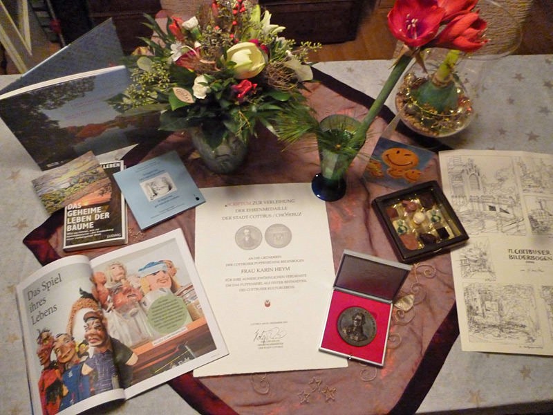 Karin wird als die Gründerin der Cottbuser Puppenbühne Regenbogen für ihre außergewöhnlichen Verdienste um das Puppenspiel als fester Bestandteil des Cottbuser Kulturlebens gewürdigt.